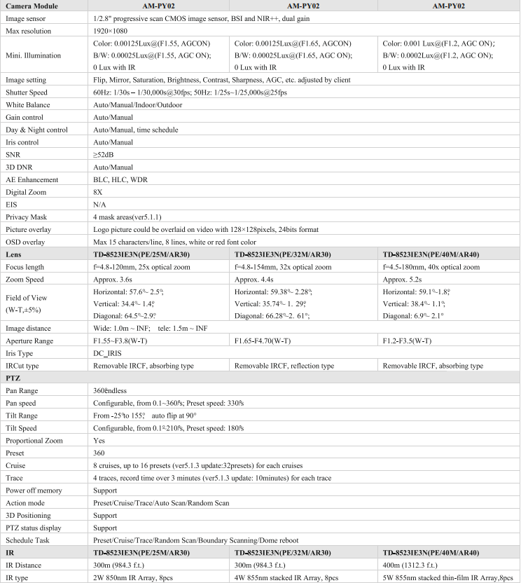 AM-PY02, the 3rd gen 5inch AI PTZ camera series, which adopts a high quality 25x, 32x or 40x optical zoom lens, and high computing AI SOC, could deliver top- notch 1920×1080@30fps image details over a wide open area. The PTZ camera can detect max 15 objects per scene and classify human/vehicles from 600m to 1000m in radius. When any of them intrude restricted area, the camera will trace, zoom fit in center of screen, snap and record and trigger alarms until object disappeared, greatly improving surveillance efficiency. The 5inch Gen3 PTZ improves many aspects to further utilize Al capacity. The revised gimbal system is up to 360°/s, which could automatically track express fast large objects at 300km/h within several miles distance. The rotation mechanics is enforced to endure over 10 millions times for long-time heavy usage. The 3rd gen PTZ adopts black-ray image and new stacked IR technology, which filter all the intrusive lights and focusing on human and vehicles themselves, thus it could track and recognize human details within hundreds of meters, challenging the most complex environment, whatever it is bright sun-shrine or in pitch black, snowy or rainy, strong headlights of cars and street lamps, etc.