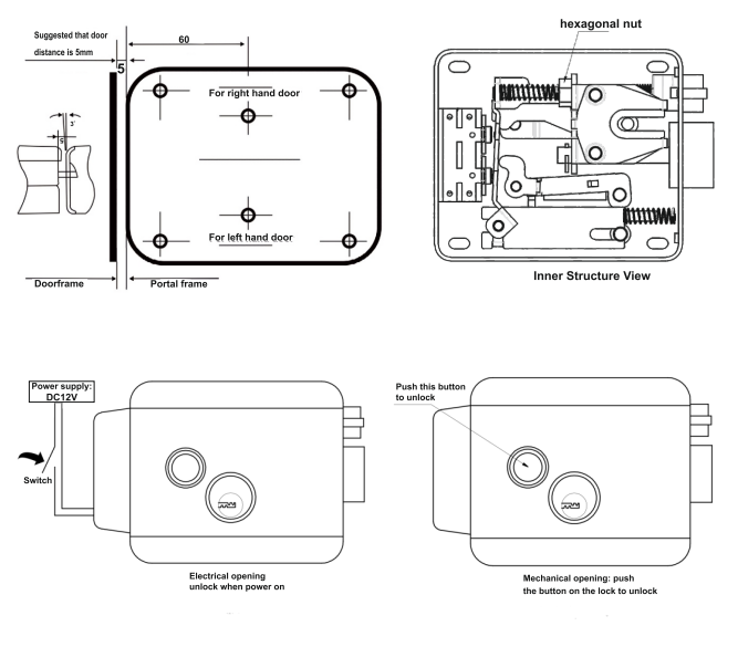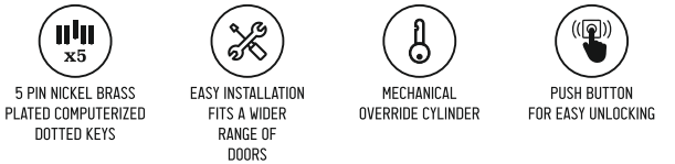 • Solid brass cylinders and latch bolt for enhanced security. Indoor push button for quick opening.